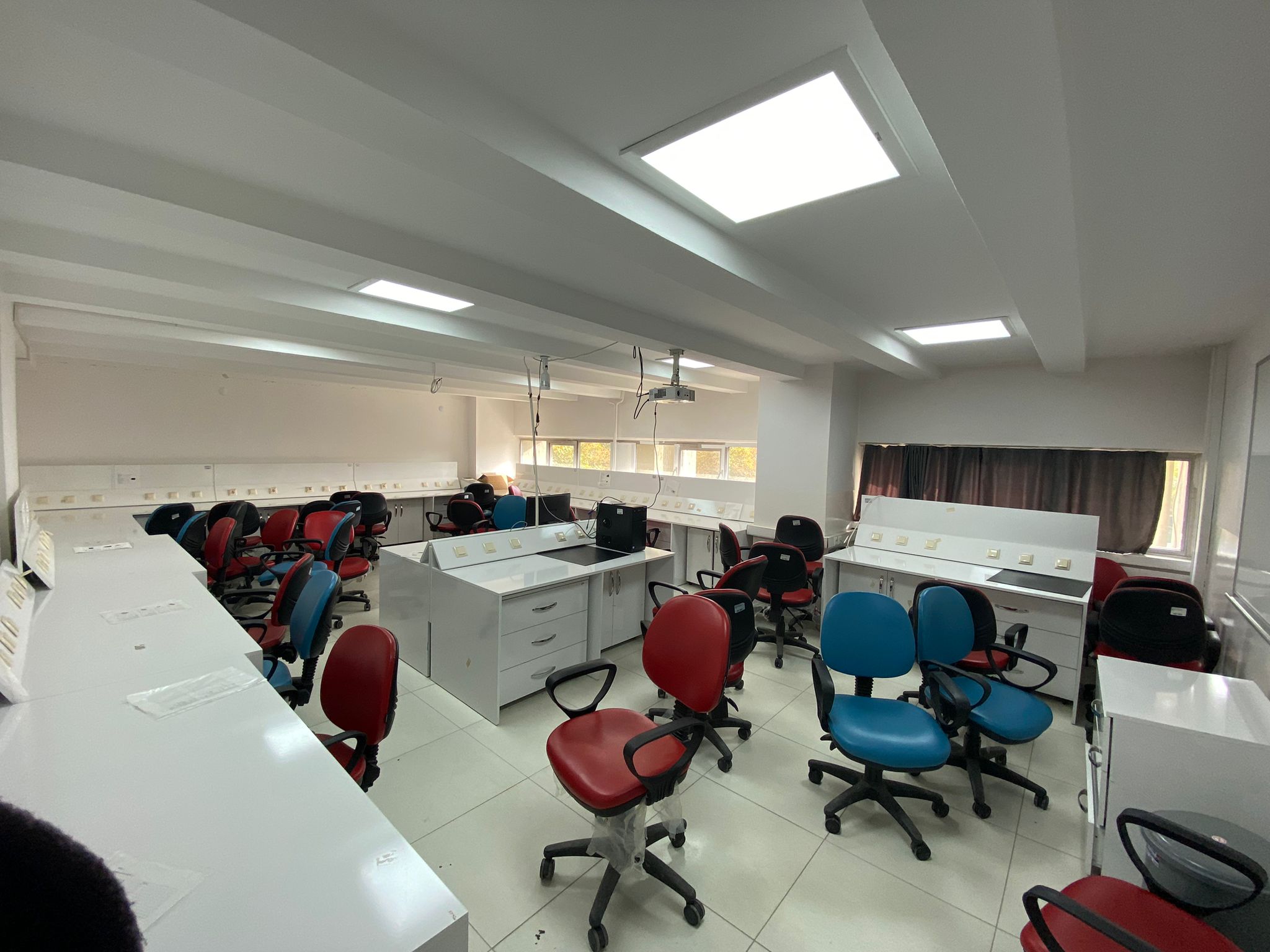 Laboratuvar geniş yerleşimiyle tüm cihazların eşzamanlı olarak kullanılabilmesine olanak sağlamaktadır. Her cihaz grubu için farklı çalışma masaları oluşturularak karışıklıkların önlenmesi sağlanmıştır. Ders anlatımlarında kolaylık sağlaması açısından yansıtma sistemlerinden yararlanılarak öğrencilerin daha kolay derse adapte olmaları sağlanmıştır.
